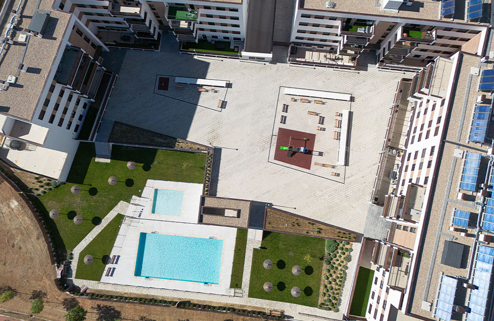 Construccion de complejo residencial que se compone de 107 viviendas de 2, 3 y 4 dormitorios con terraza, plaza de garaje y trastero. La promoción se distribuye en 5 portales y alturas desde planta baja +3 alturas + planta ático. En la planta baja se dispone de espacio disponible para albergar locales comerciales.